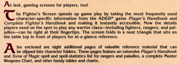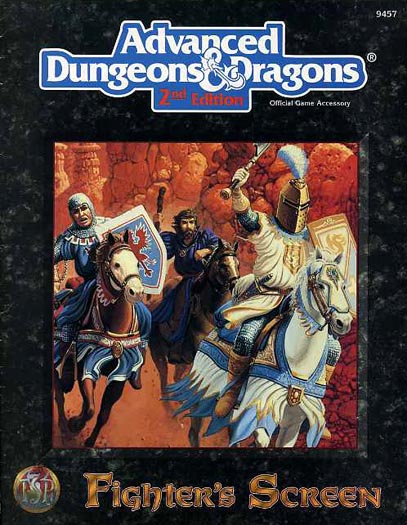 For sale is the Advanced Dungeons & Dragons Fighter's Screen. It was produced in 1994 by TSR, and features the cover, folding mini-screen and 4 card-stock sheets dedicated to helping you make the most of your warrior class character in even the stickiest situations.