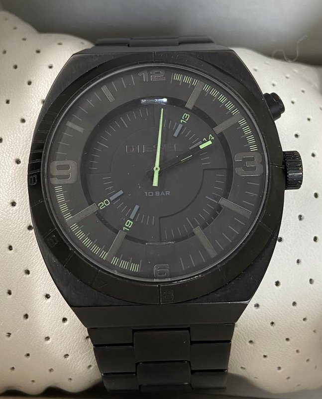 Watch Information: Gender: Men's Case Size: 42mm Dial Color: Black Material Case: Stainless Steel Material Band: Stainless Steel Diamonds: n/a Movement: Analog Quartz Water Resist: 100 Meters Water Resistant Additional Info: Packaging: Diesel Box & Papers