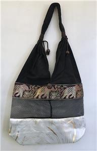 100% Rayon handbag with see through netting. No compartments inside. Button closure and lovely wooden beads on strap. The strap is about 28 inches with a 14 inch drop from the top of the straps to the top of the bag. These bohemian bags compliment any groovy outfit and are especially nice to carry all your stuff to summer festivals. So Cool!