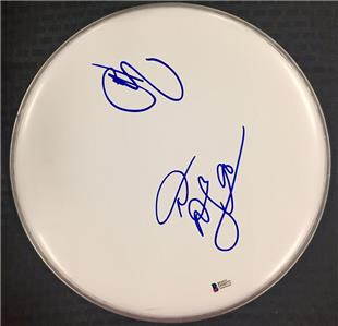 This drumhead is signed in blue Sharpie by brothers Dean DeLeo & Robert DeLeo - most well known for being founding members of the band, Stone Temple Pilots.