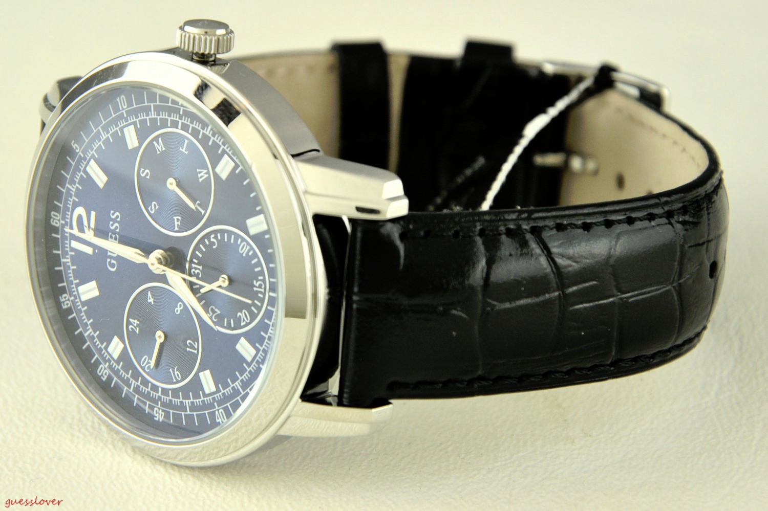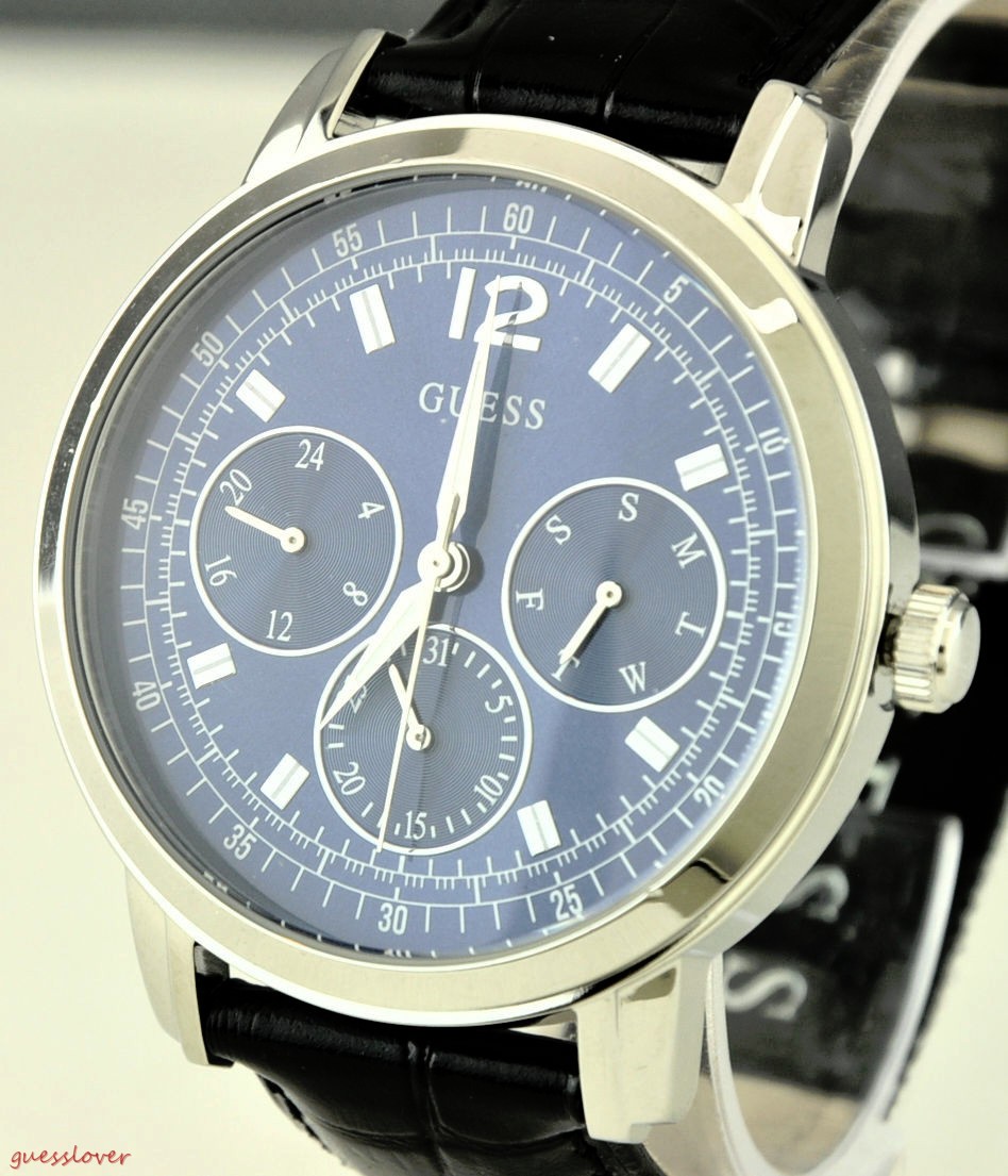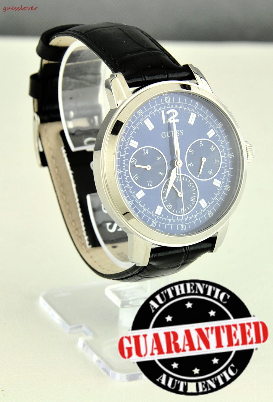 High Quality Original Strap Leather. Guess Logo inside the faceplate. Round faceplate design. One-push button. Three Pointers Dial. Japan Quartz Movement. Stainless Steel Faceplate Casing. One of the Authentic GUESS Watch Collections. Please only purchase from our store to guarantee best and Genuine Guess Collections. Limited GUESS Watch USA Collections might not be available anywhere else. Black Color bracellet. Faceplate consist of Silver Case outside with the Blue base inside the watch. Ship with Tracking Number from USA (If you choose EXPRESS MAIL Shipment).
