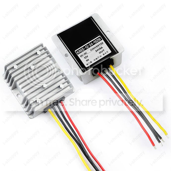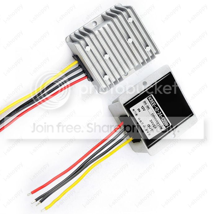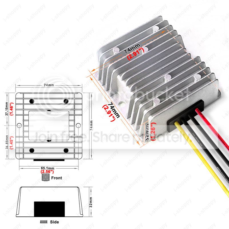 | Features: Input voltage: DC 12V(9~20V) Output voltage: DC 24V Output power: 72W-360W Output current: 3A-15A Transfer efficiency: 96% Soft start time: about 500mS Working temperature: -20 to +80 Celsius degree(Please lower power or enhance heat radiating if surrounding temp exceeds 40 celsius degree) Temp rise in full load: 50 Celsius degree Case material: die-cast aluminum Potting material: epoxy sealed Cable Length: 15cm waterproof & anti-shock protection Dimension:  Application: The converter applies to bus, CMB, large trucks, motor car, solar power generating, bus displaying sCOBn, taxi advertising sCOBn, taxi radio without interference, car audio speaker, LCD TV, LED, intercom and monitor system, vehicles, security systems, telecommunications, medical equipments, instruments etc. Notes: 1. Please add fuse in the input; negative and positive pole of voltage should not be connected reversely, or the transformer will be burn out and your electrical equipments might be damaged. 2. Please ensure enough input voltage and power so that the module will output enough voltage and power. 3. We suggest you to leave current margin for longer usage life; and if your output current reaches the Max, you must enhance cooling. Package included: 1 x DC Converter |