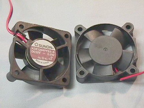 Mfg. Marking SUNON / KDE1204PFS3-8 / DC12V 0.5W / MADE in Taiwan. Rated at ~8CFM, they have sleeve bearings. They have tinned stripped leads about 300 mm (11.8") long, but no connectors.
