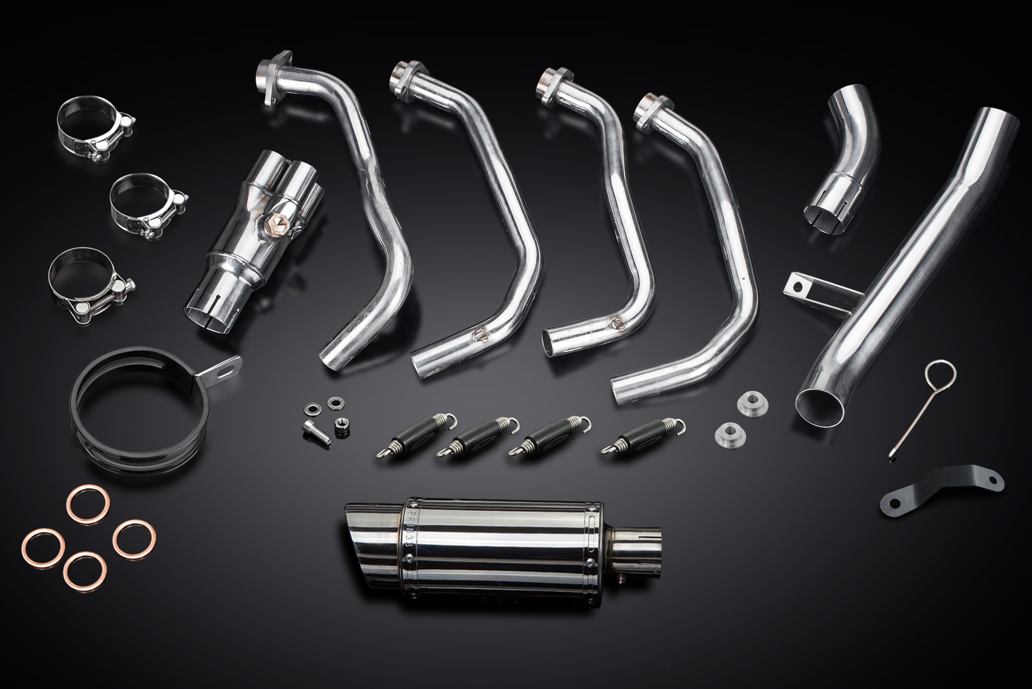 Delkevic down pipes, link pipe, slip-on muffler with a removable baffle, strap, clamps, gaskets, spring hooks and fittings