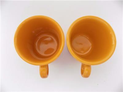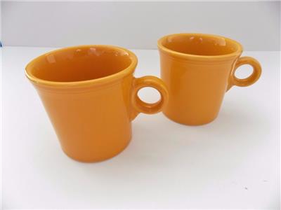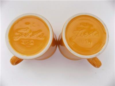 YOU ARE BIDDING ON AN WONDERFUL SET OF 2 COFFEE MUGS BY FIESTA HLC. THIS CERAMIC DINER STYLE CUP MEASURES 3 1/2 INCHES TALL AND HOLDS APPROXIMATELY 8 OUNCES OF LIQUID. THESE MUGS ARE IN MINT CONDITION WITH NO MARKINGS, STAINS, CRACKS OR CHIPS. THE HANDLE IS PERFECT, AS WELL AS, THE INSIDE. THIS MUG IS EXTREMELY CLEAN AND COMES FROM A SMOKE-FREE ENVIROMENT. IMPRINTED ON THE BOTTOM READS, "FIESTA" USA, WHICH IS IN PERFECT CONDITION.