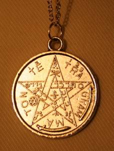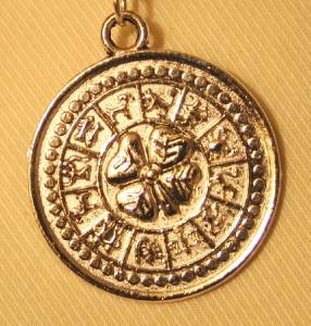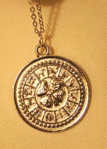 This silvertone necklace features a shiny mid-sized round amulet pendant with the zodiac wheel around the outer rim of the front and a good luck 4-leaf clover in the center. The reverse has an etch star pentagram with a shiny raised rim. It measures 1 1/8 inches wide and 1 1/4 inches long and is in new condition. The chain is 18 inches and closes with a safety catch.