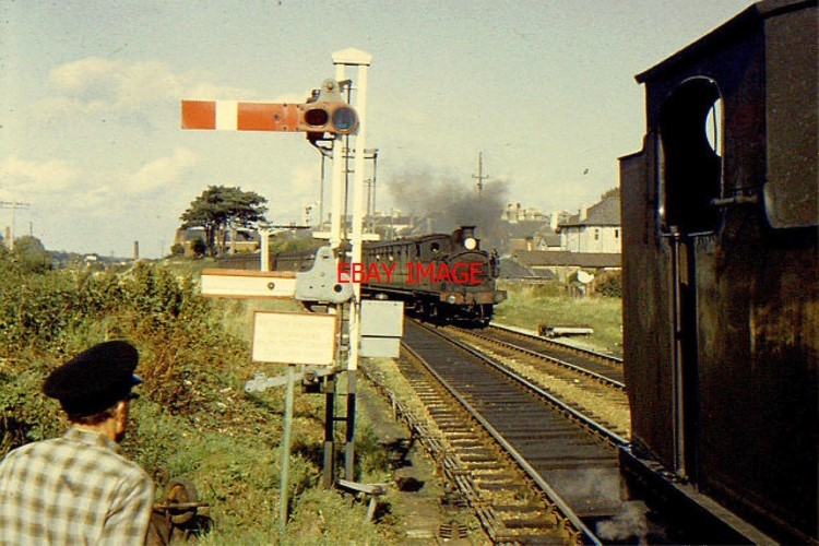 PHOTO 1965 SHANKLIN RAILWAY STATION - STEAM TRAINS PASSING TWO STEAM TRAINS PASS AT SHANKLIN RAILWAY STATION. THE TRAIN FOR RYDE IN THE FOREGROUND WAITS FOR THE TABLET GIVING PERMISSION TO OCCUPY THE SECTION AHEAD AND THE SIGNALS TO CLEAR. THE STEAM TRAINS ON THE ISLE OF WIGHT WERE THEN VERY ANTIQUATED. INFORMATION SUPPLIED BY PHOTOGRAPHER COPYRIGHT (Photograph and text in Extra Info) : RICHARD GREENPHOTO PAPER THICKNESS NORMAL PHOTOGRAPH THICKNESS