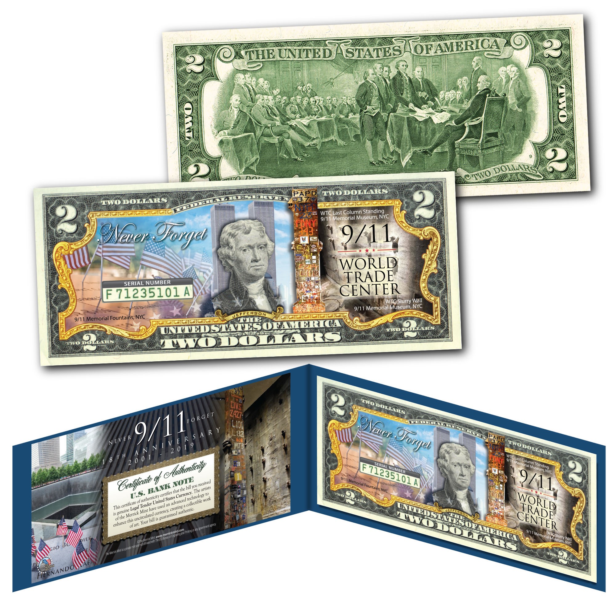 This WORLD TRADE CENTER 9/11 – 18th ANNIVERSARY uncirculated U.S. $2 Bill is Genuine Authentic Legal Tender of the United States, which has been enhanced with colorized images to NEVER FORGET the attack of the World Trade Center on September 11, 2001. The colorized images are accomplished through a revolutionary new authentic & genuine colorization process pioneered by The Merrick Mint, creating a collectible work of art. Each bill comes displayed in a blue folio with a Certificate of Authenticity to guarantee that your bills are authentic and recognized by every monetary authority around the world, therefore assuring its Collector Edition status. Each $2 Bill is in FRESH, CRISP, UNCIRCULATED condition, and was directly removed from untouched wrapped Federal Reserve sealed packs. Former U.S. President Thomas Jefferson is featured on the obverse of the note, along with the special colorization overlay. The Signing of the Declaration of Independence by John Trumbull is featured on the reverse. It is the only U.S. Currency note that features two Presidents, John Adams and Thomas Jefferson, and it is one of the most rarely seen BILLS in circulation and actual use. The Last Column, standing in the center of the 9/11 Memorial Museum’s Foundation Hall, is covered in thousands of markings and tributes placed on the beam by workers and family members. The story of how and why the markings began to appear links back to one fireman’s personal and practical act.