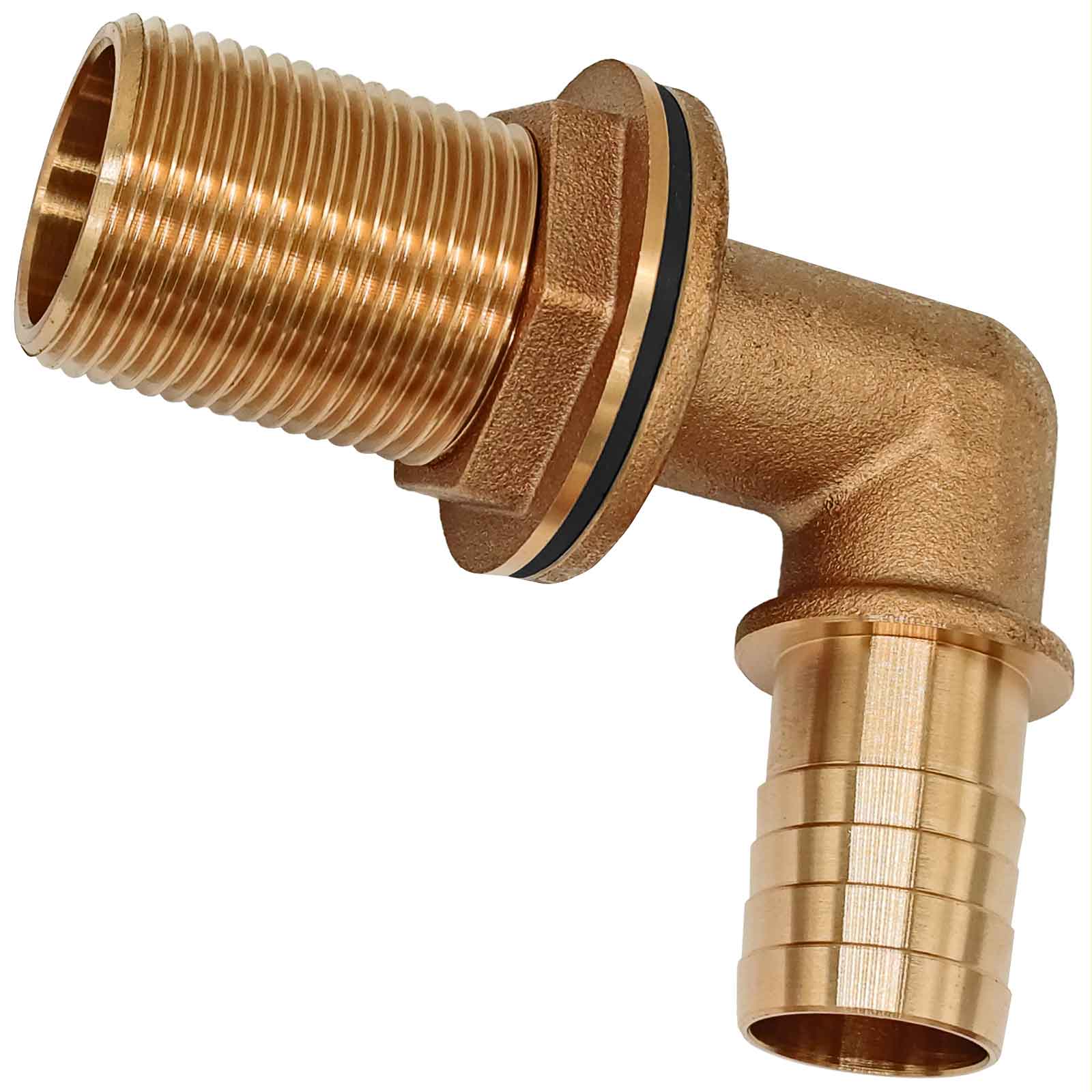Regentonnendurchführung 90° mit Schlauchtülle, Tankverschraubung, Faßverschraubung, Behälterverschraubung aus Messing mit 1 Zoll Aussengewinde und Schlauchtülle für 1 Zoll Schlauch