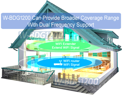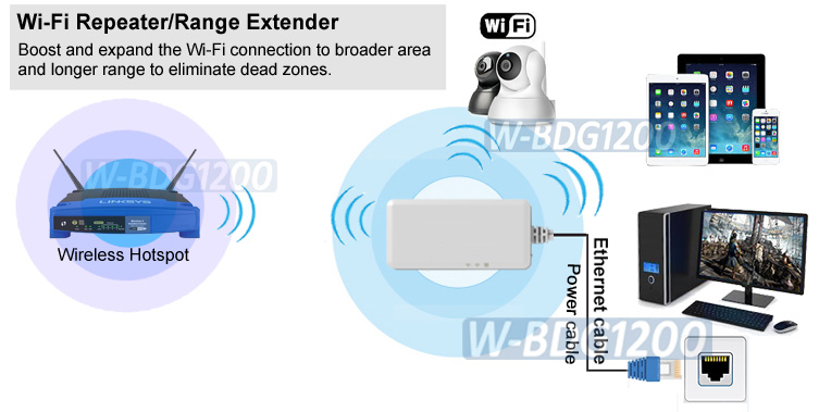 This hybrid wireless repeater helps boost the existing WiFi network coverage range up to 1000 feet or 300 meters for wide open transmission.