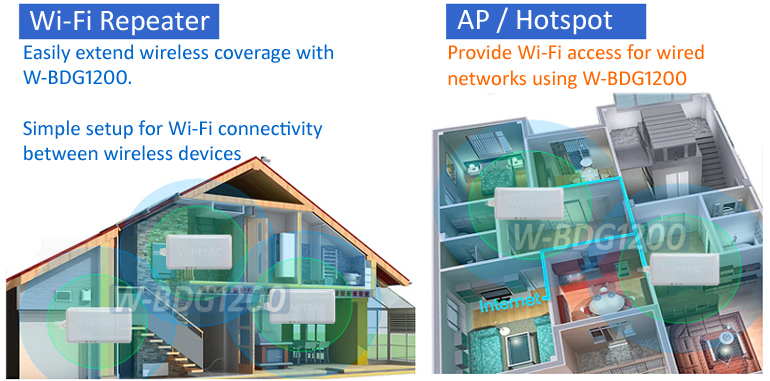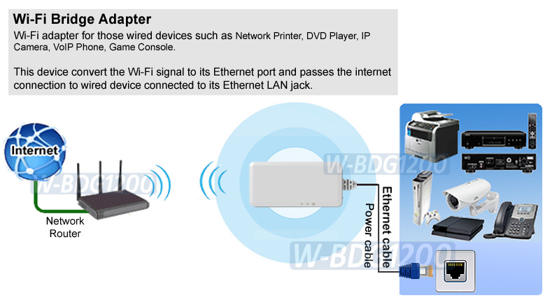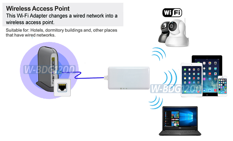 When used as a Wireless To Wired Bridge Adapter, this device will convert a Wi-Fi connection into wired Ethernet connection for hookup with wired device. Any Ethernet-equipped home A/V equipment or wired networking gear can be wirelessly connected with home Wi-Fi network or hotspot from building or smart phone with no network cables attached to them.