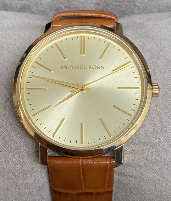 Watch Information: Gender: Women's Case Size: 38mm Dial Color: Gold Tone Material Case: Gold Tone Stainless Steel Material Band: Leather Diamonds: n/a Movement: Analog Quartz Water Resist: 50 Meters Water Resistant Features: Analog Additional Info: Packaging: Michael Kors Box & Papers