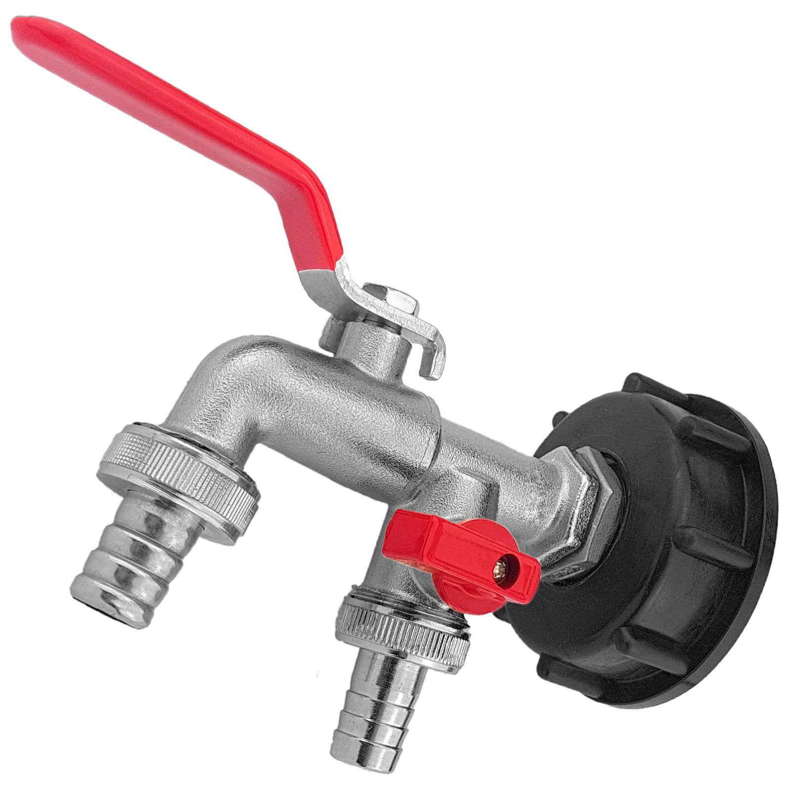 IBC-Adapter mit 1/2 Zoll Innengewinde mit Messing Hahnverlängerung 1/2 Zoll x 15mm mit 1/2 Zoll Messing Doppel-Auslaufventil mit Hebelgriff und zwei Schlauchtüllen 1/2 Zoll flachdichtend mit Dichtung und Zentrierstern.