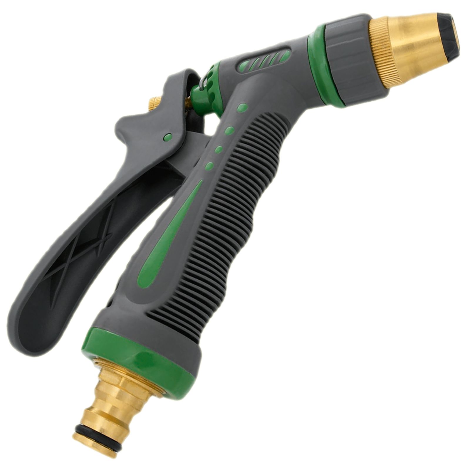 Aus Leichtmetall, massive Ausführung, kunststoffbeschichtet, Anschlussgewinde IG 3/4" mit Dichtung, stufenlos verstellbar von Sprühstrahl auf Vollstrahl, feststellbar. Mit montierter Messing-Steckkupplung.