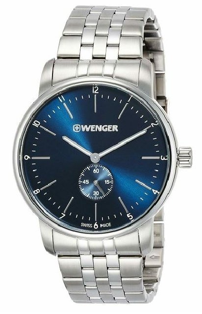 Watch Information: Gender: Men's Case Size: 42mm Dial Color: Blue Material Case: Stainless Steel Material Band: Stainless Steel Diamonds: n/a Movement: Analog Quartz Water Resist: 100 Meters Water Resistant Features: Analog Additional Info: Packaging: Wenger Box but NO Papers