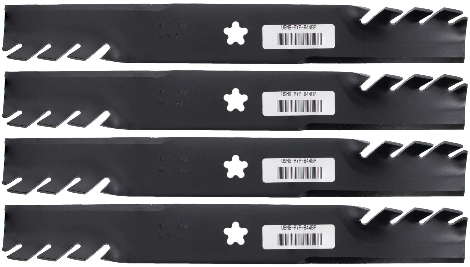 Four (4) pack of USA replacement blade fits AYP®, Craftsman®, Husqvarna®, Poulan®. Requires two (2) blades for 38-inch deck.