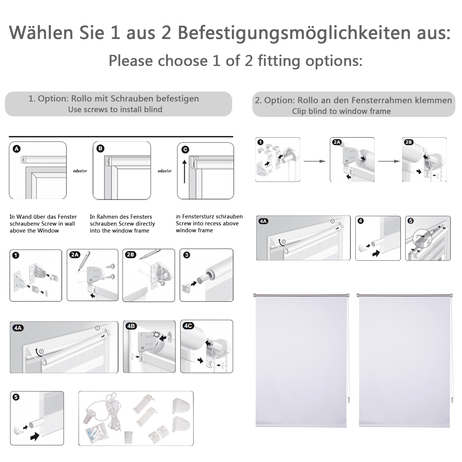 Bitte beachten SieDie maximale Tiefe des Fensterrahmens darf 2 cm nicht überschreiten und 1 cm nicht unterschreiten (ohne Dichtung)Bestellbreite bezieht sich auf die Gesamtbreite des Rollos. Die Stoffbreite ist ca.4 cm schmaler als die angegebene Gesamtbreite!Wenn das Rollo stottert/hakt beim runterziehen, prüfen Sie bitte, ob Sie den "Mund" (der offene Teil) vom Kopf des Kettenzugs nicht richtig nach aussen richten, so dass die Kette blockiert. Wenn ja, bitte drehen Sie den Kopf des Kettenzugs bis der offene Teil nicht verdeckt, dann wird Problem gelöst.Montageanleitung: (2 Wahlen: mit Klemmträger ohnen Bohren, oder mit Schraubenset zum Bohren)