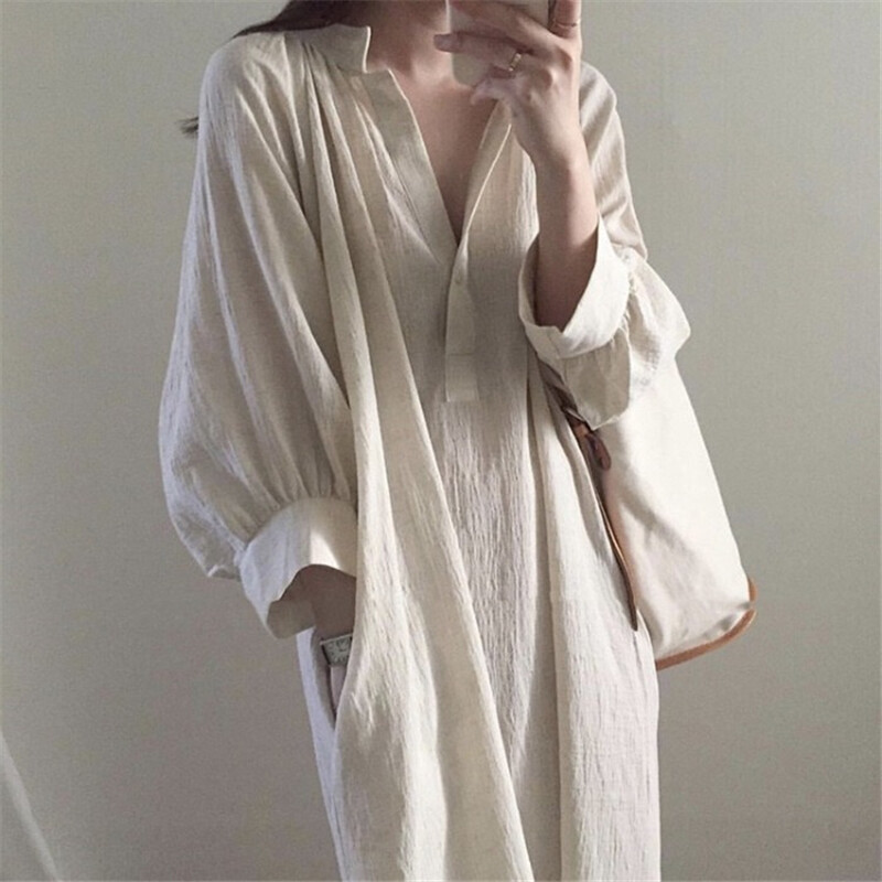 Women Cotton Linen Shirt Dress Long Maxi V-neck Loose Casual Apricot Summer Thin