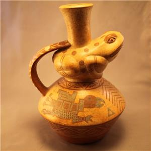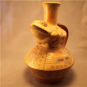 Pre-Columbian style Pottery Effigy Vessel Description: very interesting Pre-Columbian style pottery effigy vessels, in shape of a jug with a frog at the middle, 9" in height and width is 7", in overall good condition with chips to handle. This item is from early 20th century and possibly earlier.