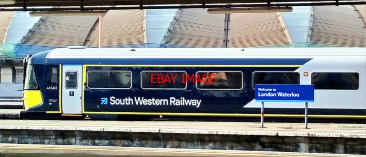 PHOTO (3) SOUTH WESTERN RAILWAY'S NEWLY REFURBISHED 442 CLASS DMU 442413 ON A BRIGHT AND SUNNY WINTER MORNING AT LONDON'S WATERLOO STATION. IT HAD RECENTLY ARRIVED AS THE REAR UNIT OF THE TEN-CAR 10.45 FROM PORTSMOUTH HARBOUR VIA GUILDFORD AND THE DIRECT LINE. WEDNESDAY 5TH FEBRUARY 2020. RON FISHERPHOTO PAPER THICKNESS NORMAL PHOTOGRAPH THICKNESS