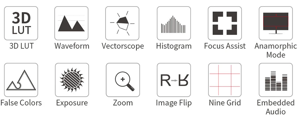 Our flexible OS is packed with an extensive suite of scopes, all operations can be done by light touching. The Video OS includes tools for focus, framing & exposure (waveform, RGB parade, vectorscope, RGB histogram, histogram, audio meter, focus peaking, zoom, zebra, false color, frame guides, safe area, etc.) along with a flexible 3D LUT load tool (use built-in LOG to Rec.709 video or upload .cube files), HDR monitoring and options for anamorphic de-squeeze monitoring.