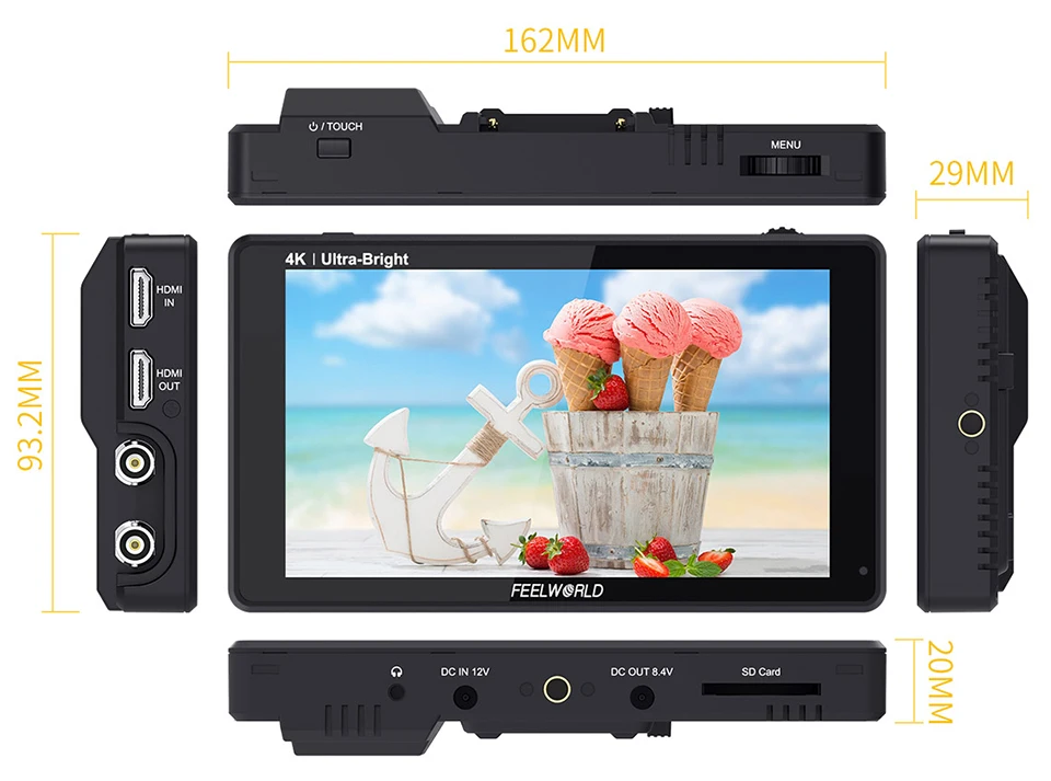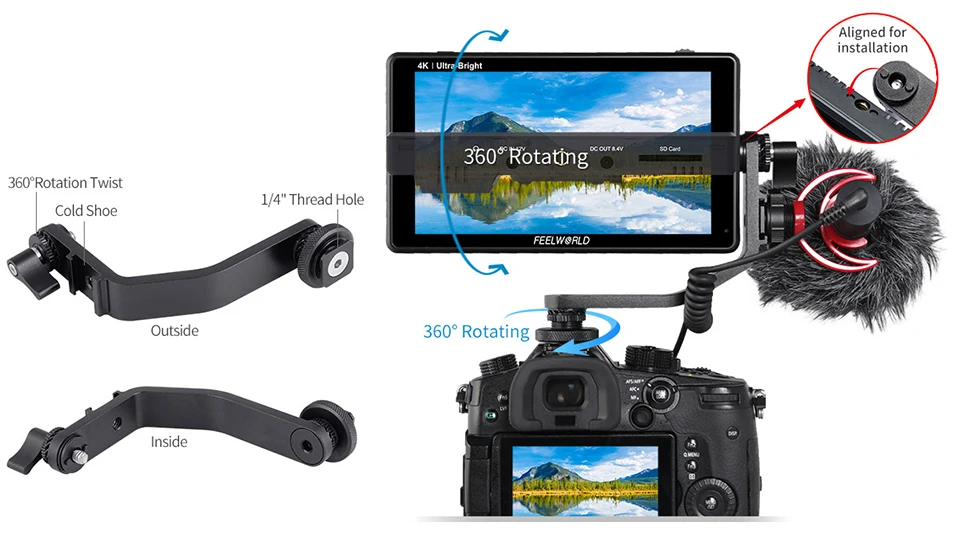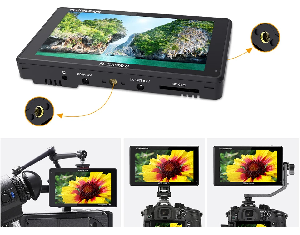 The standard sized mounting points make it easy to mount and are compatible with third party rigging equipment. There are 2 mounting points located on the bottom and right. Using the bottom 1⁄4 inch hole, you can securely attach it to the top of your camera as the ultimate viewfinder! The 1⁄4-inch hole on the right side can be mounted on other equipment with magic arm, bracket, etc., for the entire crew to monitor the screen.