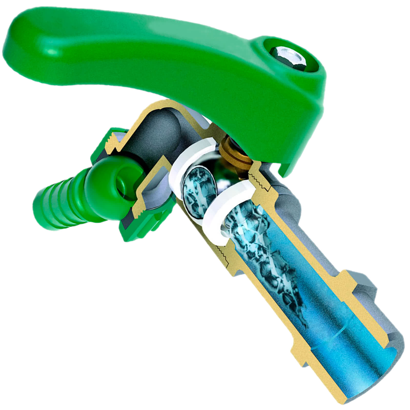 Schwere Ausführung. Körper aus vernickeltem Messing CW617N. Griffhebel grün beschichtet aus Aluminium. Ergonomische Griffform.