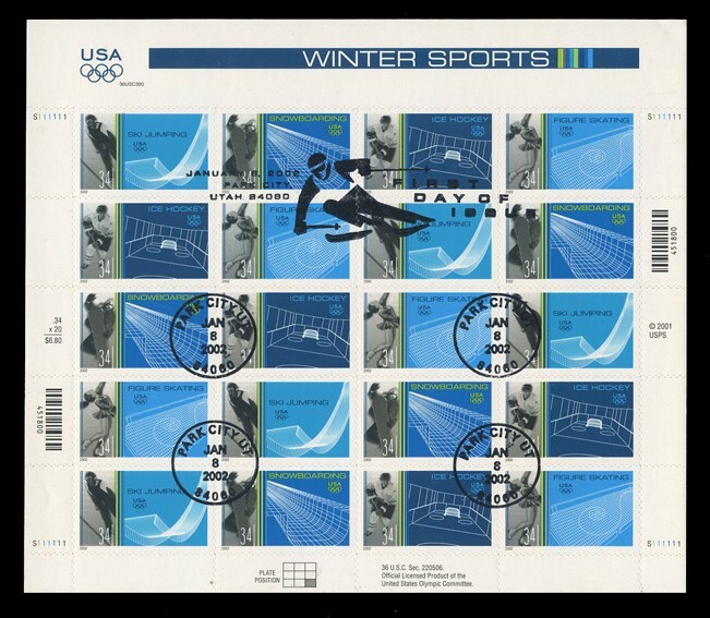 UNITED STATES USED STAMPS - PANES & SHEETS Scott #3552-5, 34c Winter Sports, Full Sheet (Pane) of 20, Used This pane was NOT commercially used; it was cut from either an uncacheted First Day Cover or a Souvenir Page and is still on paper. I strongly urge that you DO NOT TRY TO SOAK IT OFF. I've done this myself, and the results are usually not good. Mount it WITH the paper. MINIMUM ORDER, $10 PLEASE.