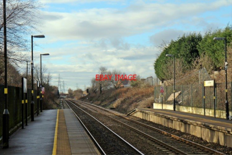 PHOTO LOOKING WEST LEA GREEN RAILWAY STATION BEHIND THE FENCE AT THE END OF THE OPPOSITE PLATFORM WAS EVIDENCE OF A CATENARY MAST FOUNDATION PRESUMABLY IN PREPARATION FOR THE ELECTRIFICATION OF THE LINE FROM LIVERPOOL TO MANCHESTER. COPYRIGHT (Photograph and text in Extra Info) EL POLLOCKPHOTO PAPER THICKNESS NORMAL PHOTOGRAPH THICKNESS