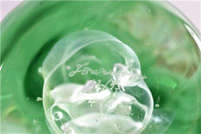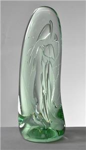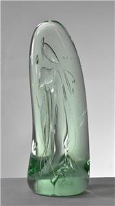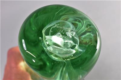 Brian Lonsway art glass green sculpture. Toledo Ohio artist. Signed on the bottom and dated 1993. Very nice condition. Light wear on the bottom. 7 1/2" tall x 2 5/8" at base. ap19610