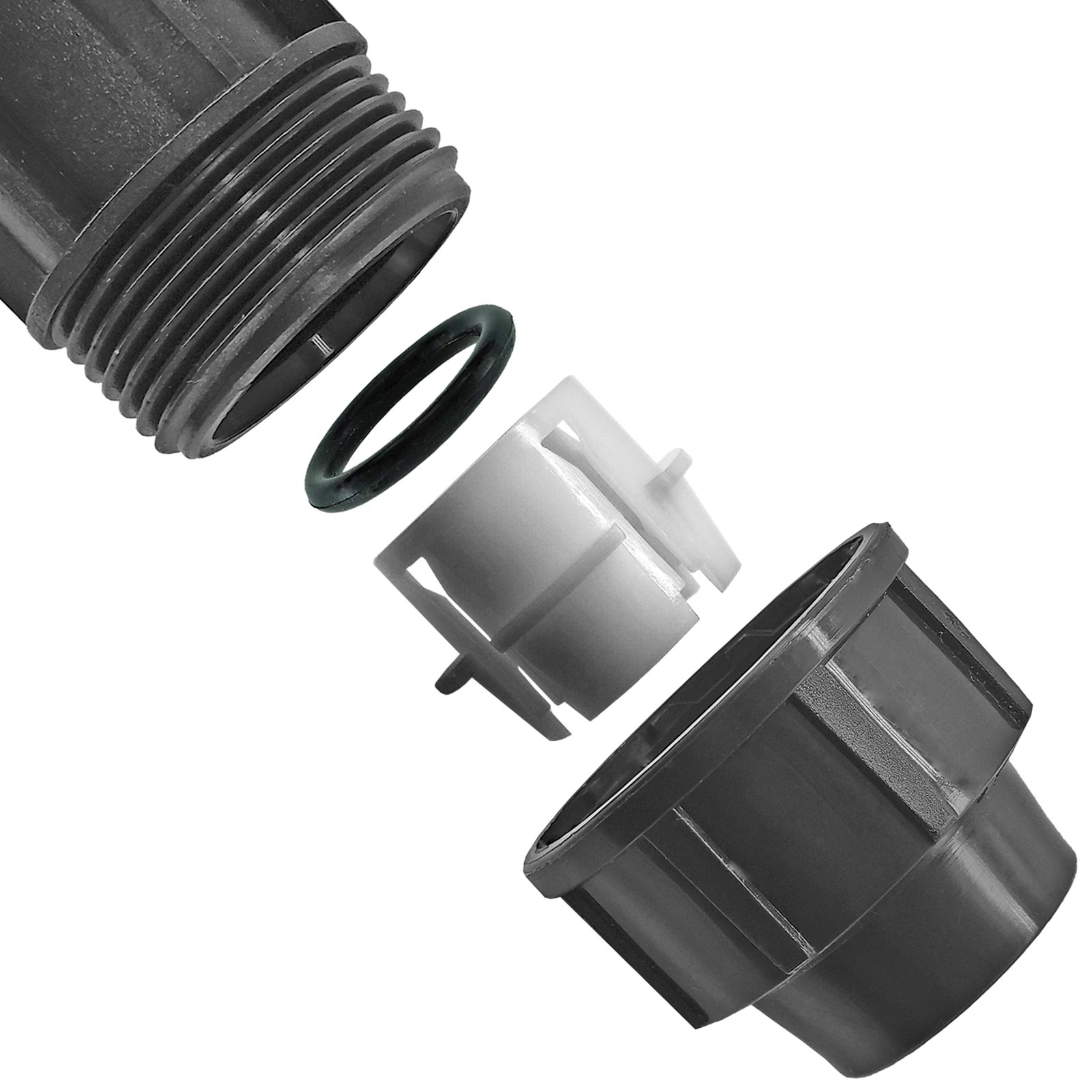 Zur Montage werden zuerst die Überwurfmutter und dann die Spannhülse und dann die Dichtung auf das Rohr geschoben. Dann die Überwurfmutter bis zum Anschlag gegen den Fitting-Körper anziehen. Von Extra-Werkzeug zum Anziehen bei PP-Fittings raten wir grundsätzlich immer ab, auf Grund von Beschädigungen. Alles soll ordentlich handfest angezogen werden. Wenn die Mutter nicht ausreichend fest angezogen wird, kann es am O-Ring tropfen, oder das Fitting kann sich gar vom Rohr lösen.