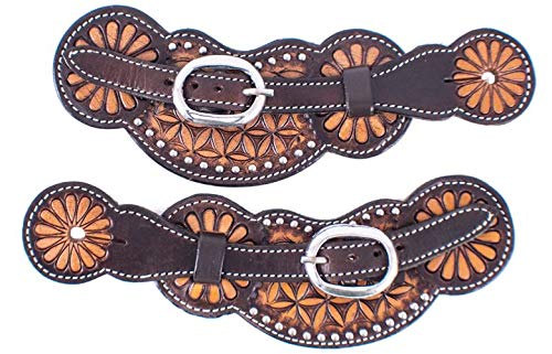 Showman Ladies Floral Tooled Leather Spur Straps. These straps feature dark brown leather with a medium floral tooled design. Spur straps come with stainless steel buckles. Adjusts 10" - 11".