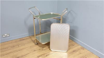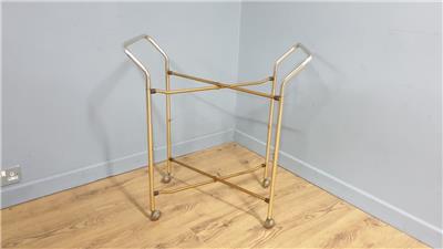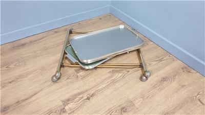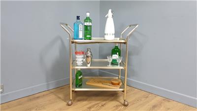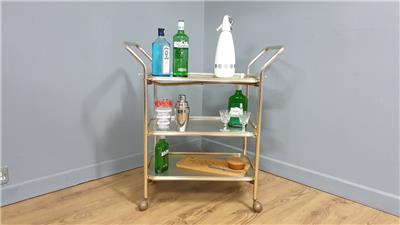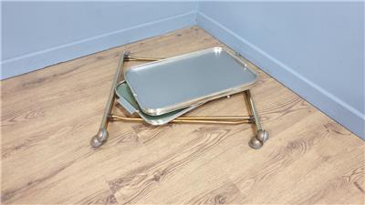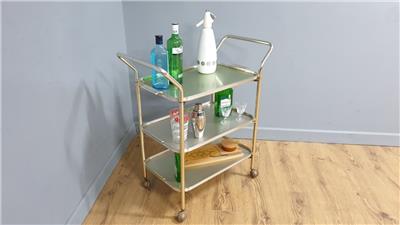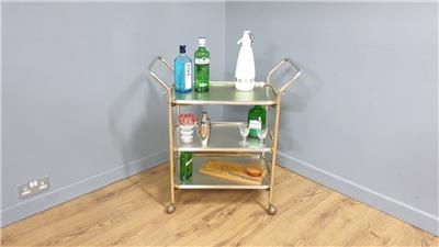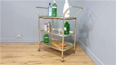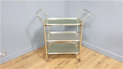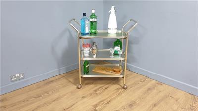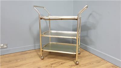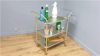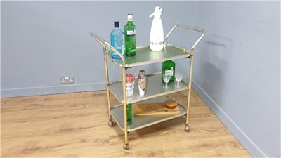Stylish little vintage three tier drinks trolley on original wheels. Unique little item with silver/gold trays that are all removable. Metal tubular X frame with removable handles to fold the frame flat for easy storage. Great example from the era!