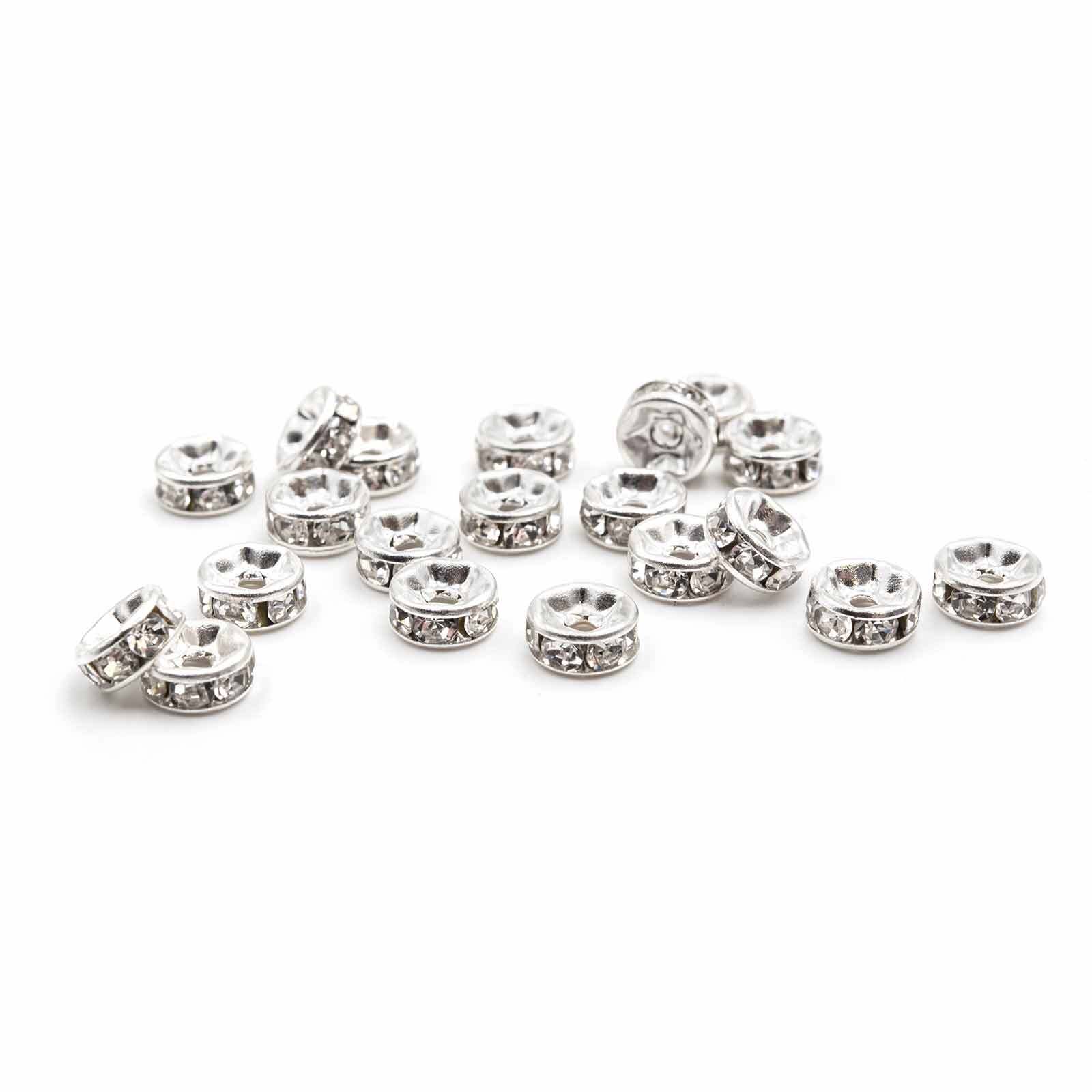 Zwischenperlen aus Messing in silberfarben zum Schmuck selber basteln. Die Perlen sind mit Strasssteinen in weiß besetzt. Fädele die Metallperlen zusammen mit Perlen auf ein elastisches Band, um niedliche Perlenarmbänder im Girlie Look zu kreieren.