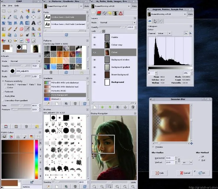 Full suite of painting tools: brush, pencil, airbrush, clone, gradients, patterns