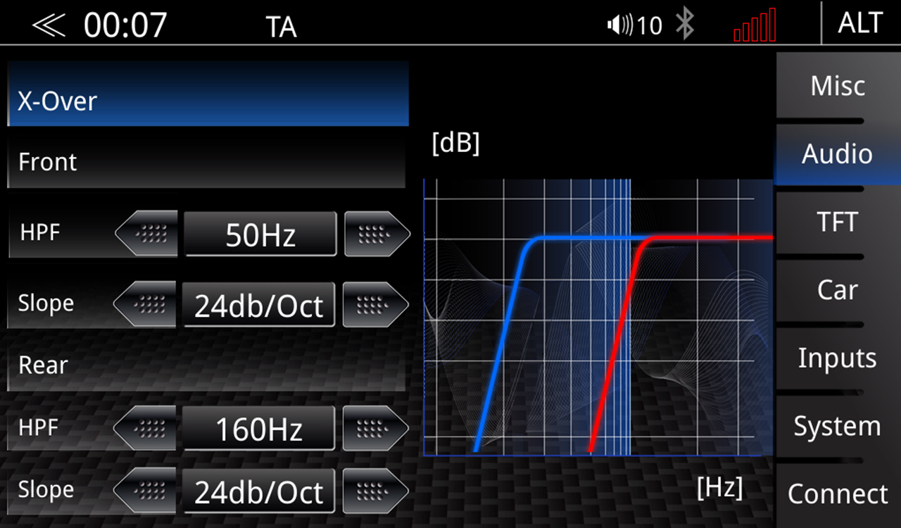 Der Z-E2065 verfügt über eine DSP-basierte aktive Frequenzweiche mit wählbaren 12 dB und 24 dB/Okt. Flankensteilheiten. Die wählbaren Hochpass Trennfrequenzen für die Front und Rear Kanäle sind: 32/40/50/63/80/100/ 125/160 Hz. Die Tiefpass Trennfrequenz und Flankensteilheit werden im Subwoofer-Setup eingestellt.