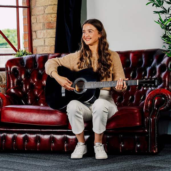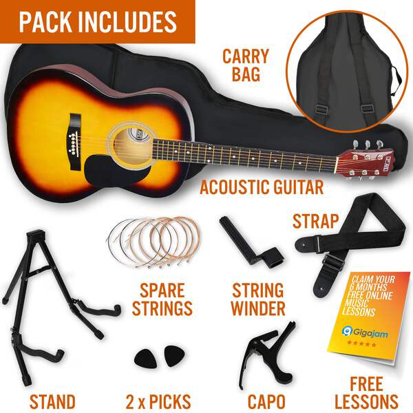 The guitar provided within this package is a standard acoustic guitar, featuring a dreadnought shape and steel strings. A combination which ensures great tone and projection. This particular guitar is supplied in a very attractive blueburst finish, with a transparent blue stain moving to black-burst edges. Which is sure to catch the eye and provide a modern appearance to your guitar.