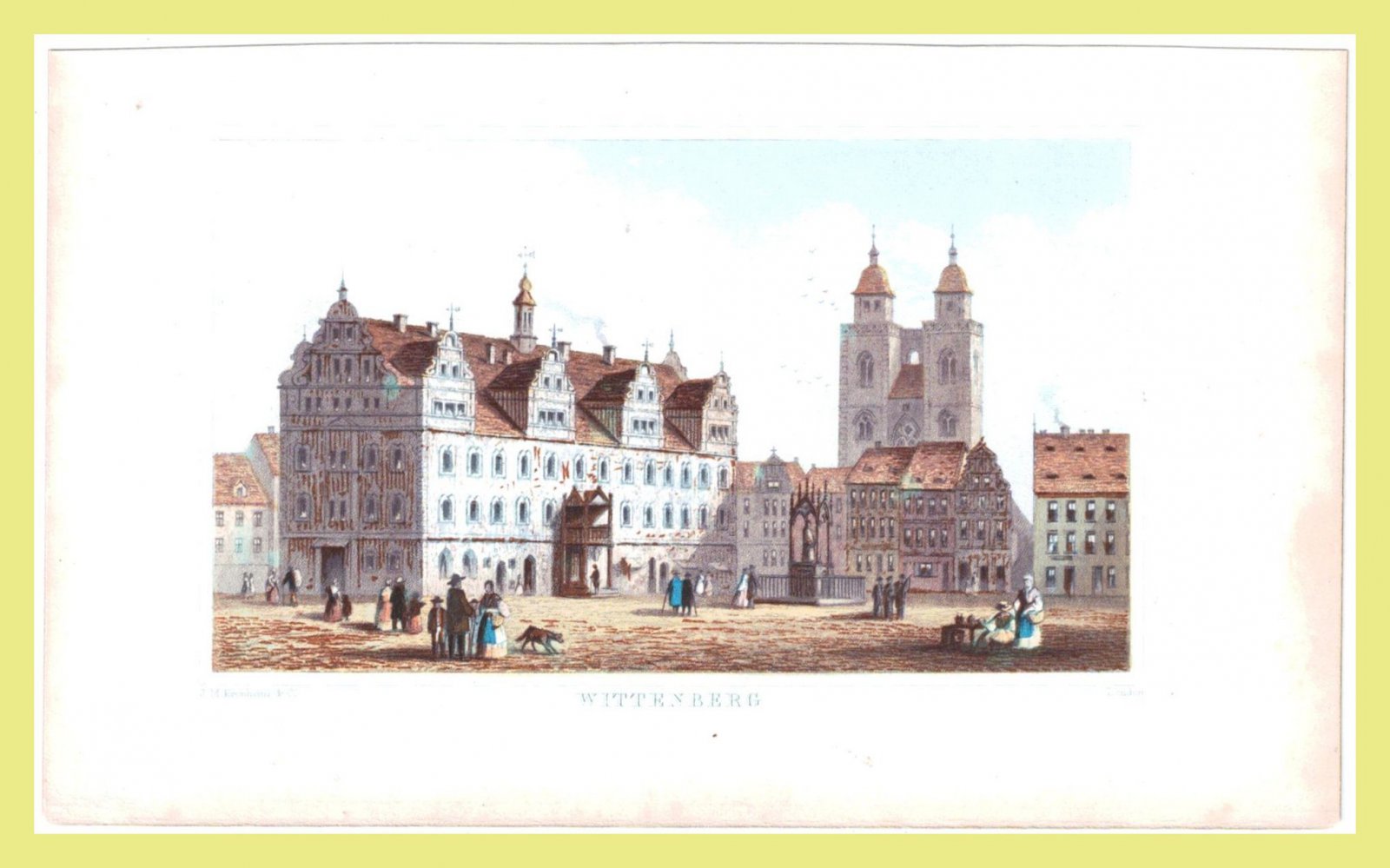 Eine sehr schöne kleine Ansicht von Wittenberg, Original-Lithographie wohl aus "Footsteps of the Reformers", 1862. Reine Bildgrösse (ohne Schrift): 6,4 x 11,3 cm, Blattgrösse: 9,7 x 16 cm. Im äusseren Rand etwas gebräunt, insgesamt ansonsten recht gut erhalten! Blick auf den Marktplatz und die Stadtkirche, vorn reiche biedermeierliche Figurenstaffage. Ein äusserst dekoratives Blatt mit feinem Kolorit. Original, kein Nachdruck, für die Echtheit wird garantiert!