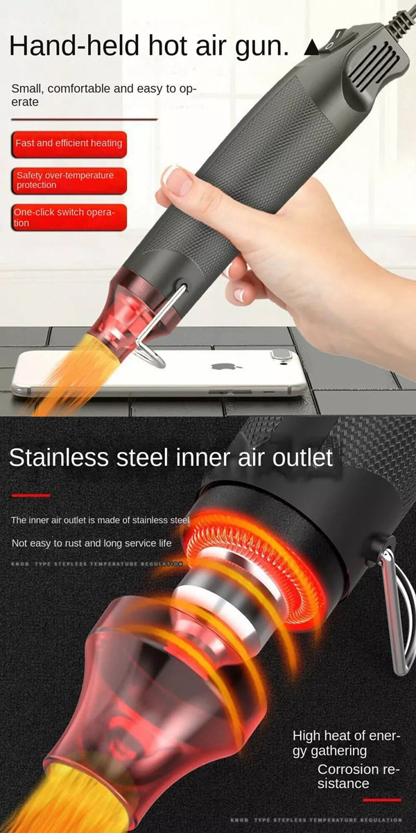 - With ABS material outside and stainless steel inside, this hot air gun is simple and
