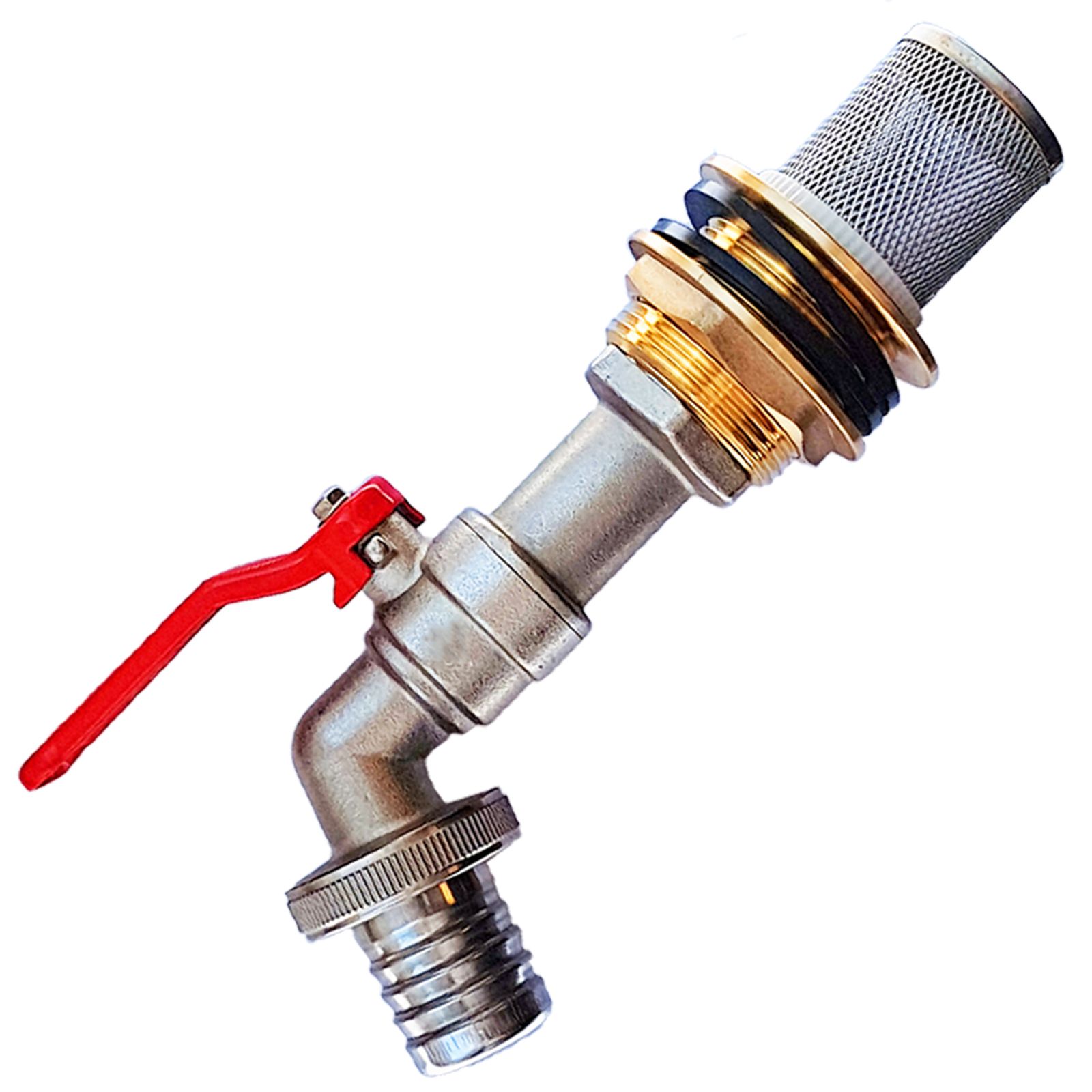 Regentonnen-Durchführung aus Messing mit Kugelhahn und Schlauchtülle und Vorsatzfilter aus Edelstahl