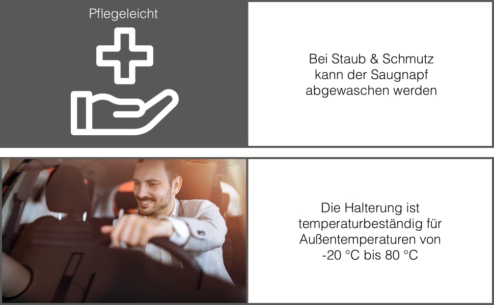 ✅Pflegeleicht & Robust: Die Halterung ist temperaturbeständig und eignet sich für Außentemperaturen von -20 °C bis 80 °C. Bei Staub & Schmutz kann der Saugnapf abgewaschen werden
