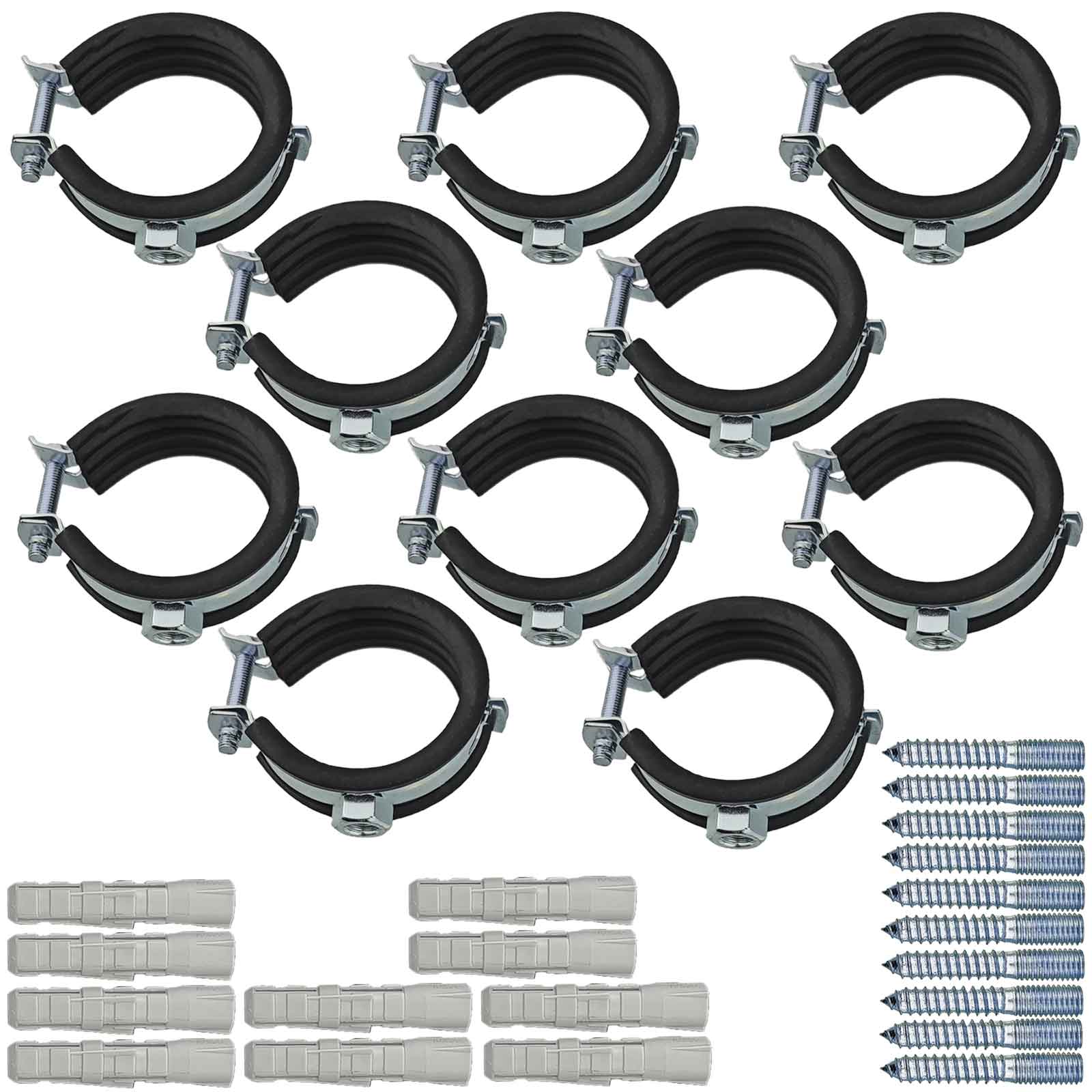 Set 10 Stück Rohrschellen mit Schallschutz 10-116mm + Stockschraube + Dübel
