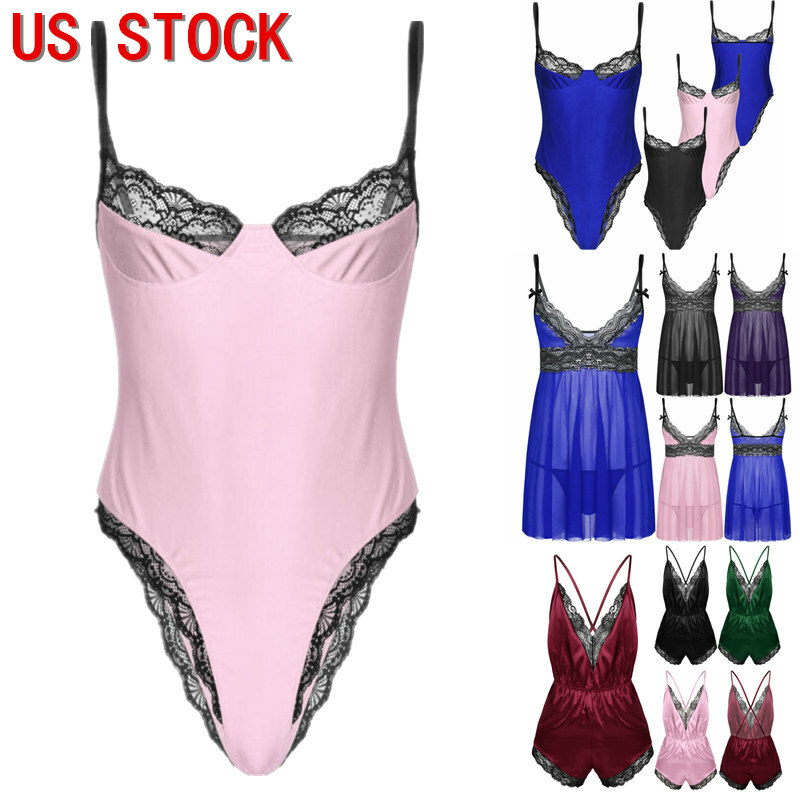 Mens Silky Satin Pajamas Lace Trim Sleepwear Boxer Shorts Jumpsuit Cami Dress