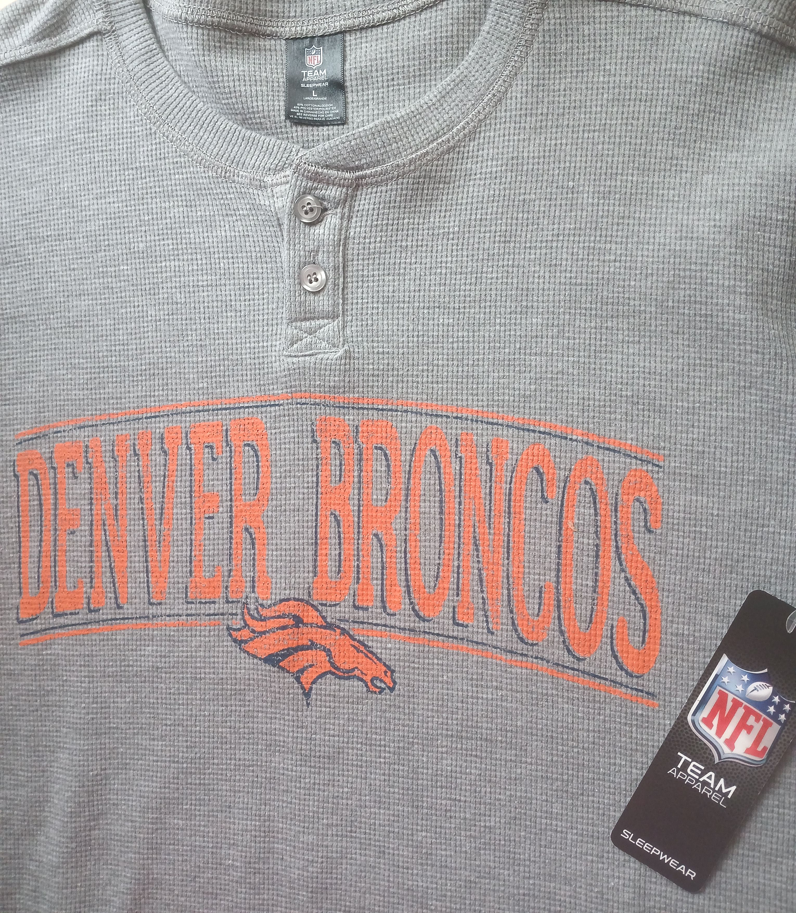 Concepts Sport Denver Broncos men's Huddle long sleeve thermal Henley top.  Size XL (measures about 23 inches across the chest and about 30 inches in length).   This luxuriously soft top can flexibly be worn to the game, to the bar, at home watching the game on TV and then it can be worn to bed!  The top is  a 60% cotton/40% polyester blend.  It has a screen printed team logo at the chest, cuffed sleeves and is officially licensed by the NFL.  Brand new, with tags, it retails for 39.99 but is now on sale for $10.99.