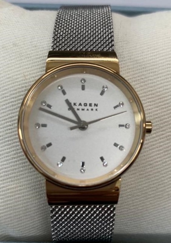 Watch Information: Gender: Women's Case Size: 26mm Dial Color: White Material Case: Stainless Steel Material Band: Stainless Steel Diamonds: n/a Movement: Analog Quartz Water Resist: 50 Meters Water Resistant Features: Additional Info: Packaging: Skagen Box & Papers