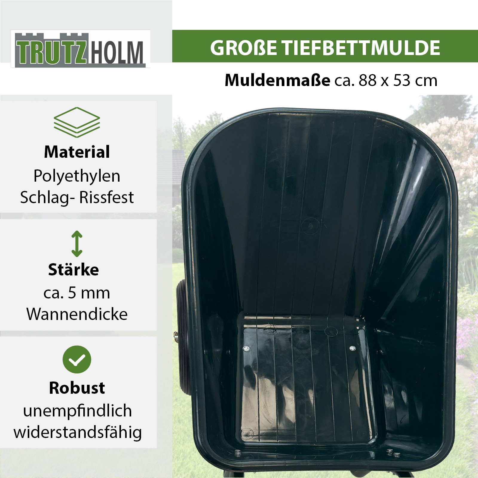 - Schlagfeste, hochwertige Polypropylen-Mulde mit stabilem vorderen Muldenstützbügel