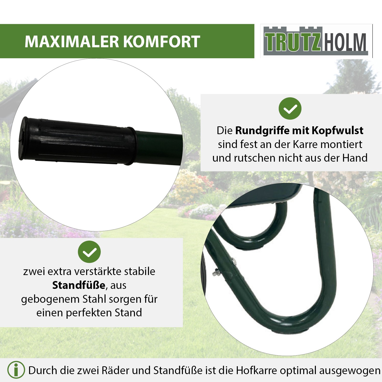 Dabei bieten die zwei pannensicheren Räder, im Vergleich zu einer 1-Rad Karre, zusätzliche Sicherheit, da sie kippsicher geschoben werden kann.