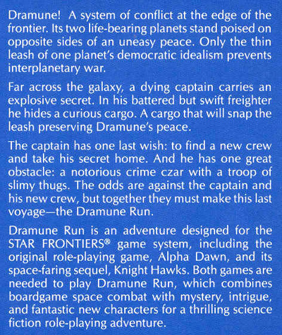 For sale is the TSR Star frontiers adventure module Dramune Run. It was produced in TSR in 1984 and features an adventure far across the galaxy - See the 2nd photo provided below for a detailed description. Condition is NEW: still in its original shrink-wrap and tightly sealed in its wrapping – never opened, never used – Beautiful!