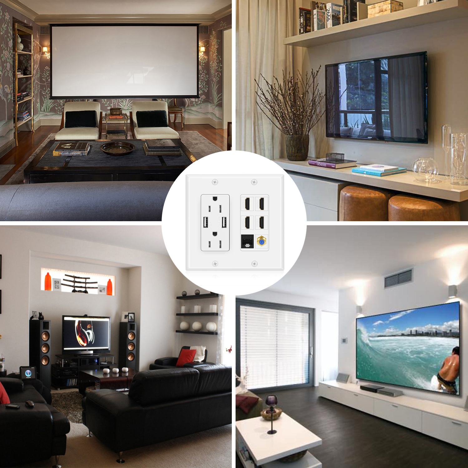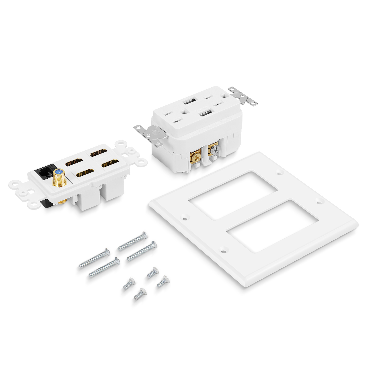Upgrade your connectivity and power solution with the TNP Media Wall Plug Outlet Plate. This HDMI to Cat6 wall plate is designed to keep your workspace or living space tidy and free from unnecessary cable clutter. The HDMI wall outlet features a double cable wall plate setup, accommodating dual 15A power outlets, 4 HDMI ports, a Cat6 RJ45 Ethernet port, a coaxial cable outlet, a keystone jack, and 2 USB-A ports.Installation is a breeze with its standard-size fitting and easy-to-plug setup. This electrical box HDMI is crafted with high-quality, heat, and impact-resistant materials. As a UL-listed product, your safety is our priority. The HDMI USB wall plate also includes outlets with USB for your charging convenience.The TNP Wall Plug Outlet Plate is the ultimate solution for your power and connection needs. It features a USB socket wall outlet and blends seamlessly in any setting - your home, office, or commercial establishment. The receptacle with USB ports and the USB electrical outlet's white color adds a touch of elegance to your space. With TNP, you invest in superior quality, efficient design, and ultimate convenience. The standard USB outlet and the fast USB wall outlet ensure your devices are always charged and ready. Simplify your digital life with TNP, featuring the fast charging USB outlet. Order yours today!Feature: