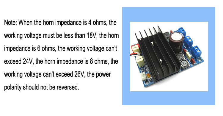 When the horn impedance is 4 ohms, the working voltage must be less than 18V, the horn impedance is 6 ohms, the working voltage can't exceed 24V, the horn impedance is 8 ohms, the working voltage can't exceed 26V, and the power polarity should not be reversed. |